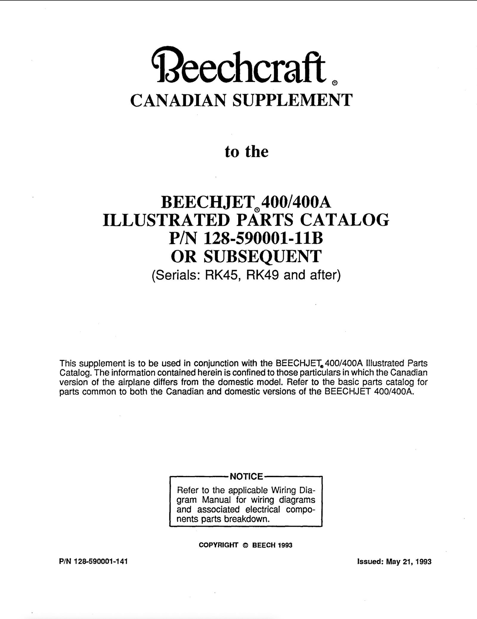 This supplement is to be used in conjunction with the BEECHJETs 400/400A Illustrated Parts Catalog. The information contained herein is confined to those particulars in which the Canadian version of the airplane differs from the domestic model.